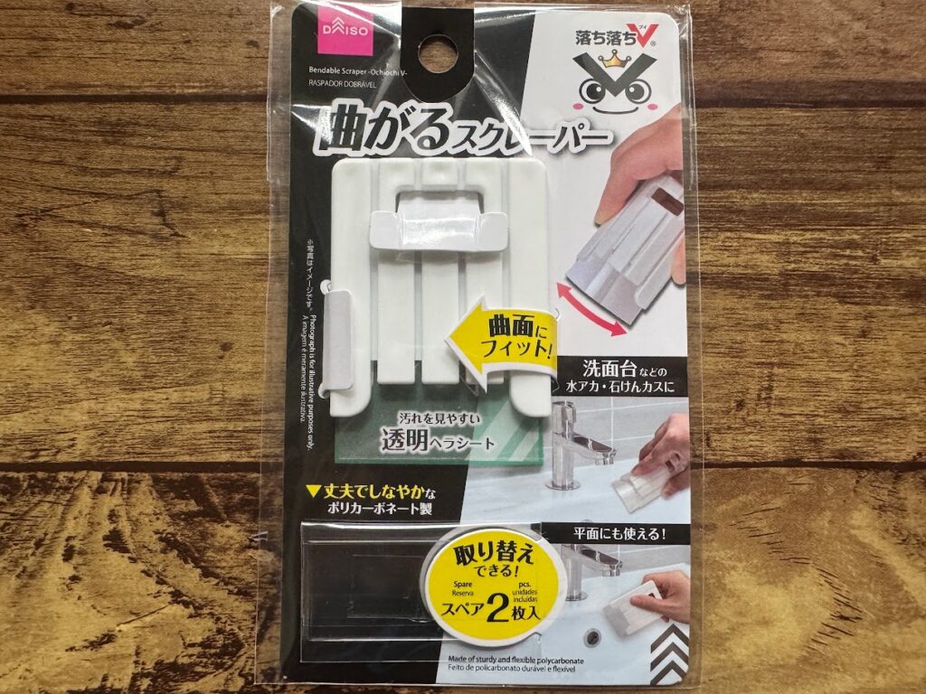 ダイソーの曲がるスクレイパーは、細かい汚れ取りに重宝しています。お風呂の椅子の湯アカを落とす、水アカを削り落とすなどのときに便利です。曲がるので、洗面台やキッチンのすき間にフィット。力を入れずに汚れが落ちるのがありがたいポイントです。